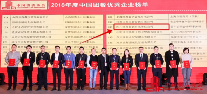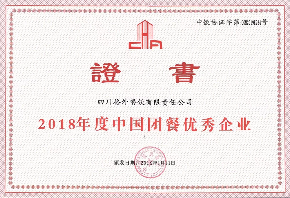 四川格外餐饮有限责任公司凭借“安全、标准、营养、创新”的发展理念、优质的管理以及良好的业绩,荣获了“2018年度中国团餐优秀企业”。